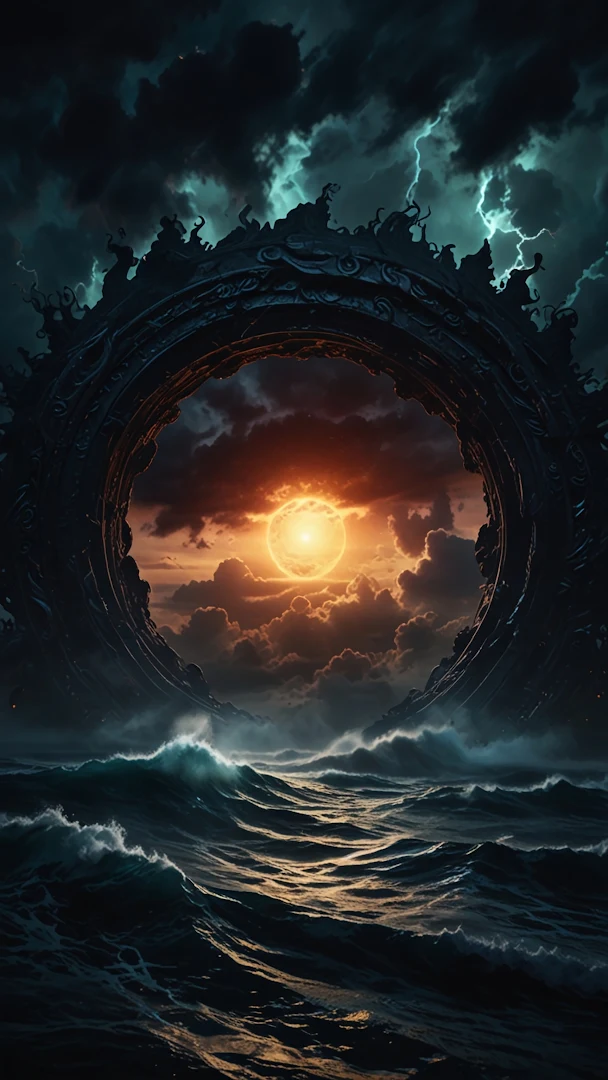 A massive, intricately carved circular structure rises from turbulent seas, framing a blazing sunset sky while electric blue lightning cracks through the storm above.