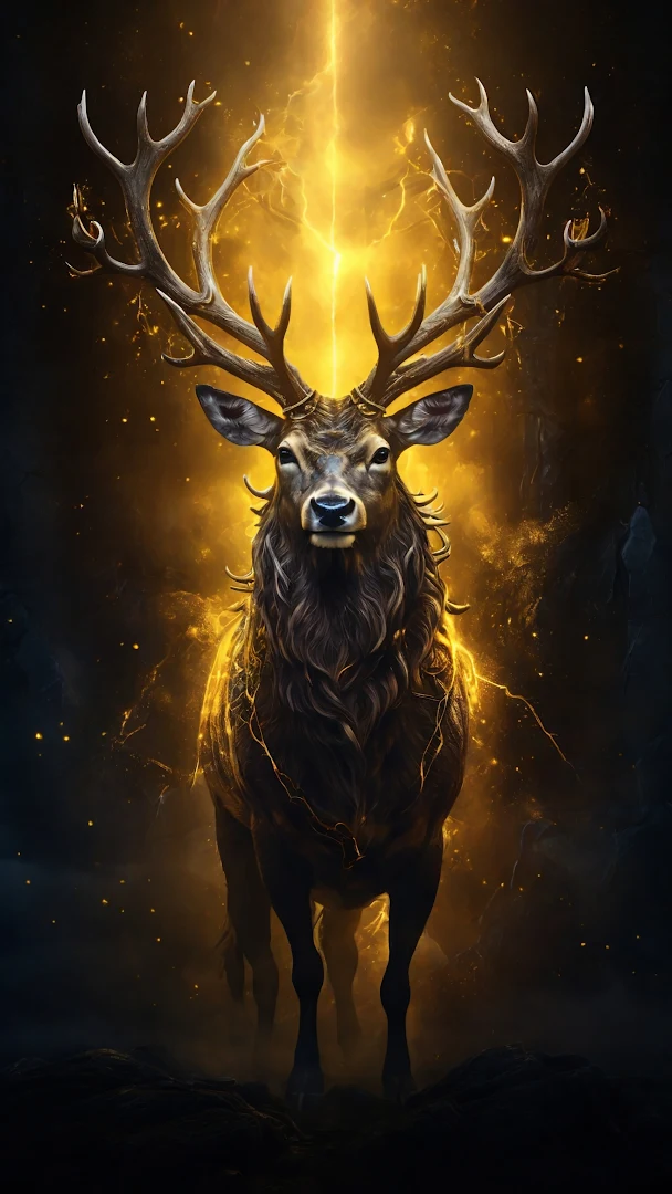 A powerful stag with enormous, intricate antlers stands illuminated by a radiant golden light that crackles like lightning, casting an ethereal glow against a dark, misty backdrop.