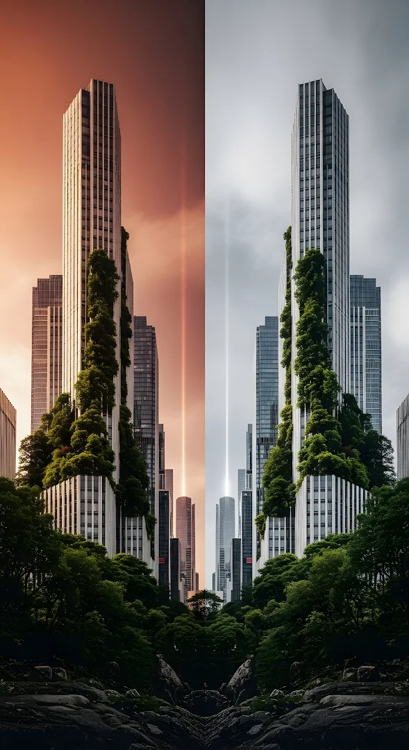 A conceptual, vertically split image showcasing modern skyscrapers integrated with dense green foliage, contrasting the warm glow of sunset on one side with the cool light of an overcast day on the other.