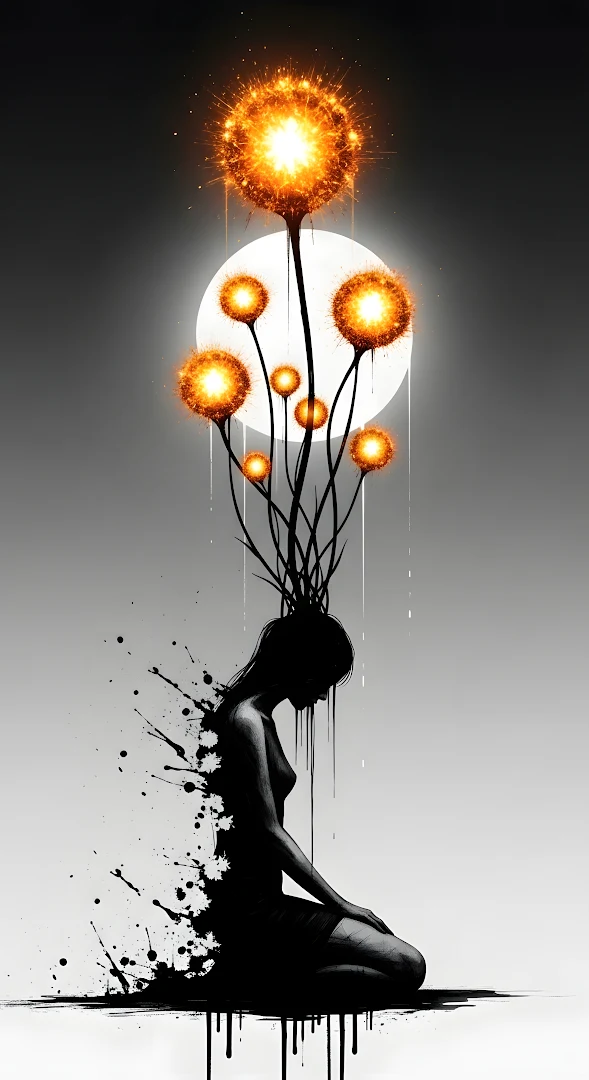 A powerful, high-contrast abstract image showing the silhouette of a kneeling woman dissolving into ink splatters, with glowing orange, dandelion-like sparkler flowers emerging from her head against a gray background.