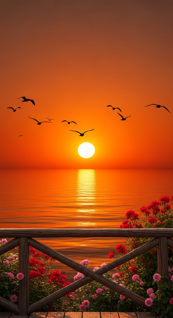 A dramatic vertical photograph captures a flock of seagulls in silhouette flying over a reflective ocean under a huge, glowing orange sun and cloudy sky, anchored by a rustic wooden fence and blooming pink roses in the foreground, with the intense sun serving as the central focal point.