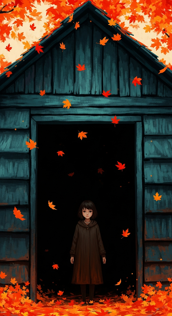 A vertical, moody, painterly illustration of a young girl in a long, dark brown coat standing inside a large, pitch-black doorway of a weathered, dark wooden building, with bright orange autumn leaves falling from the top.