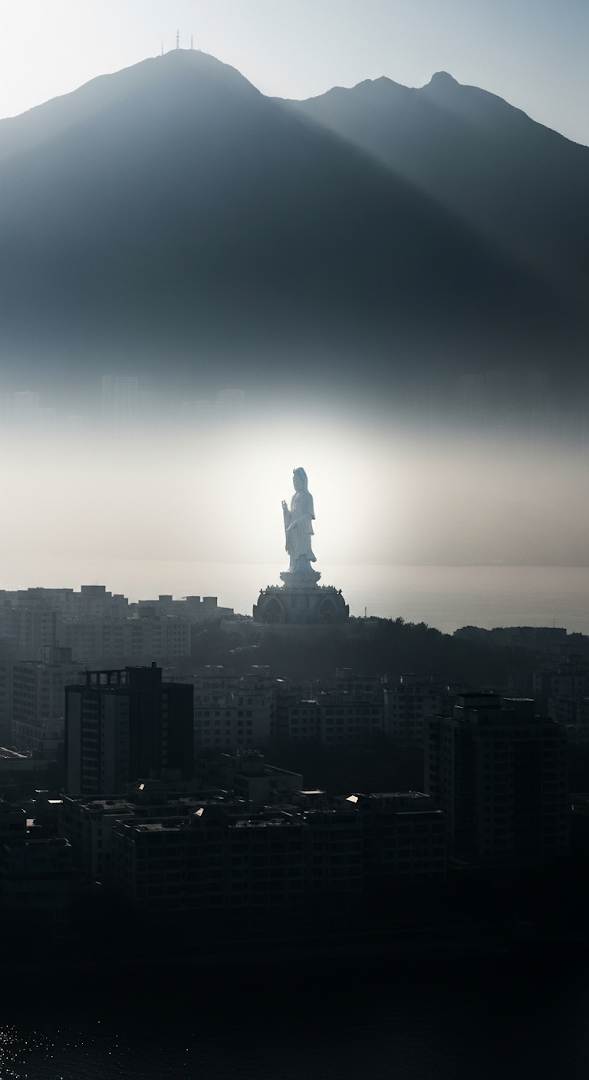 An ethereal, monochromatic photograph captures a towering white statue, likely Guanyin, appearing to float above a dense cluster of dark, silhouetted buildings and a harbor, set against a vast, hazy, misty mountain range under bright light.