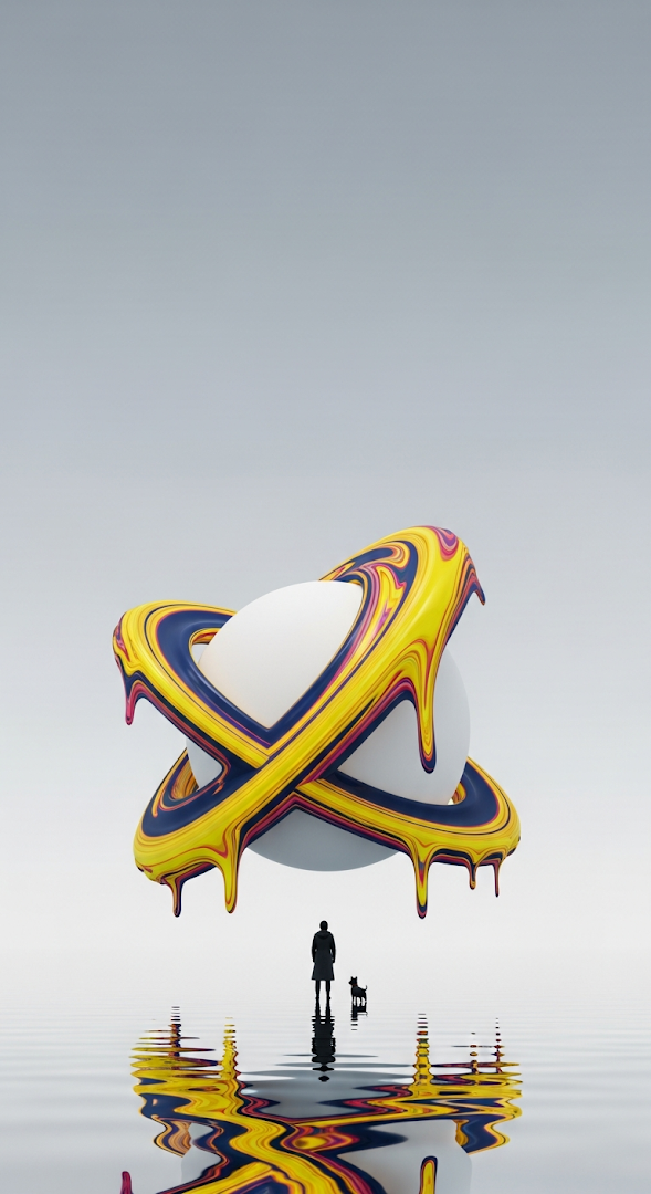 A stunning surrealist vertical digital art piece features a minimalist, silhouetted figure and a small dog standing on a perfectly reflective water surface, overshadowed by a massive, abstract white sphere with swirling yellow and blue rings, providing vast, clean negative space in the upper grey area.