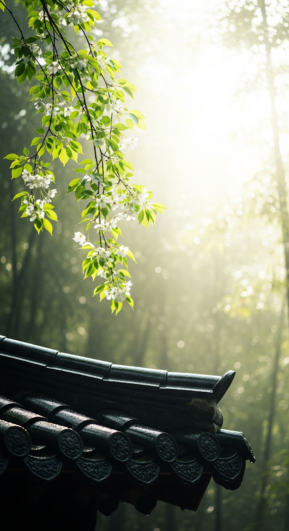 A vertical illustration capturing a serene moment with a branch of small white flowers and green leaves hanging over the dark, traditional tiled corner of an Asian-style roof, silhouetted against a misty, sun-drenched forest background.