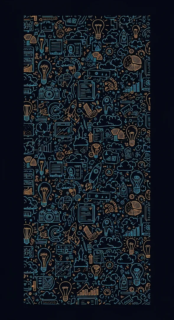 A dark, vertical seamless pattern featuring numerous hand-drawn doodles and sketches related to technology, business, and innovation, rendered in teal and gold outlines on a deep blue-black background.