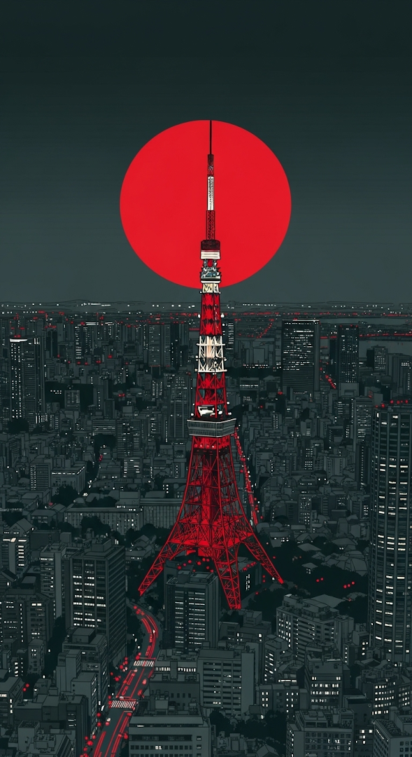A dramatic architectural illustration featuring the Tokyo Tower against a massive red celestial body.