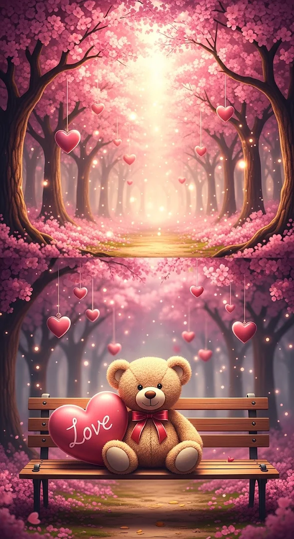 A soft-focus whimsical scene of a fluffy teddy bear sitting on a park bench with a pink heart in a glowing blossom forest.
