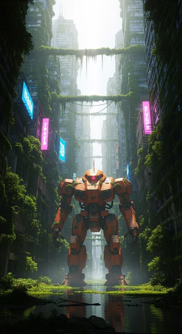 A cinematic low-angle shot of a weathered mecha standing amidst lush urban decay and glowing neon signage.
