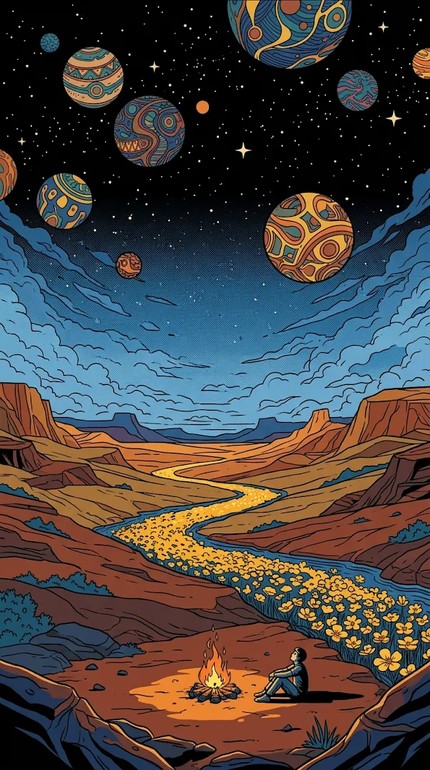 Whimsical flat-style illustration of a traveler sitting by a campfire in a desert canyon under a sky filled with patterned planets and stars.