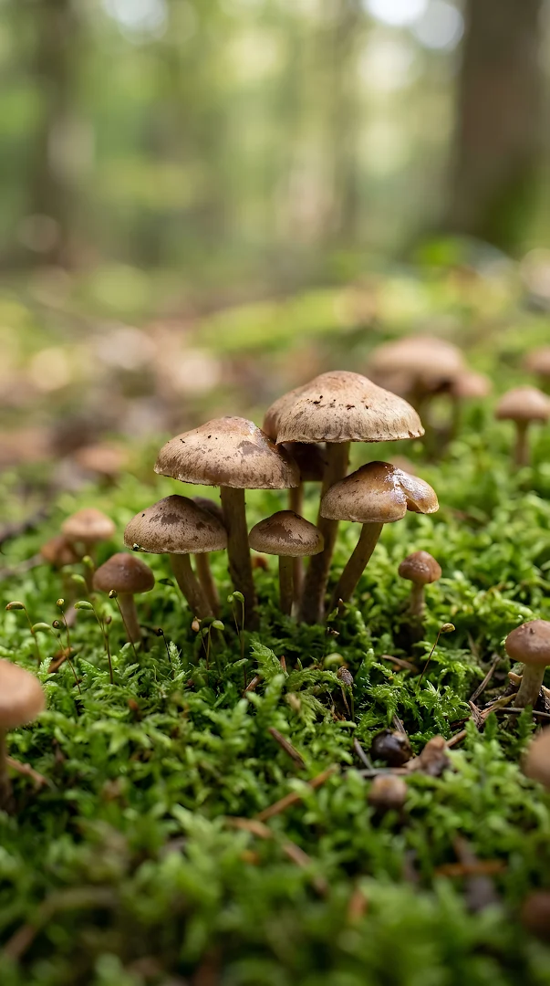 Small cluster of brown wild mushrooms nestled within soft green moss, capturing the quiet beauty of forest life.