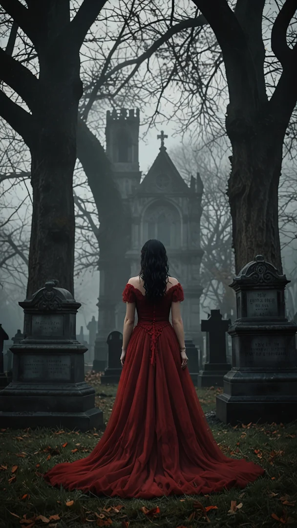 A woman in a flowing red gown stands with her back to the viewer in a foggy, atmospheric graveyard, framed by bare trees and ancient tombstones under a gloomy sky.