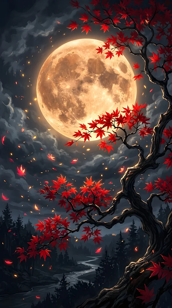 A cinematic view of a large glowing full moon framed by vibrant red autumn maple leaves against a dark night sky.