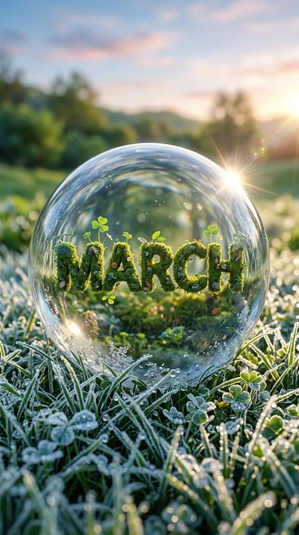 The 3d render features a conceptual glass bubble capturing the transition from winter to spring through seasonal symbols.