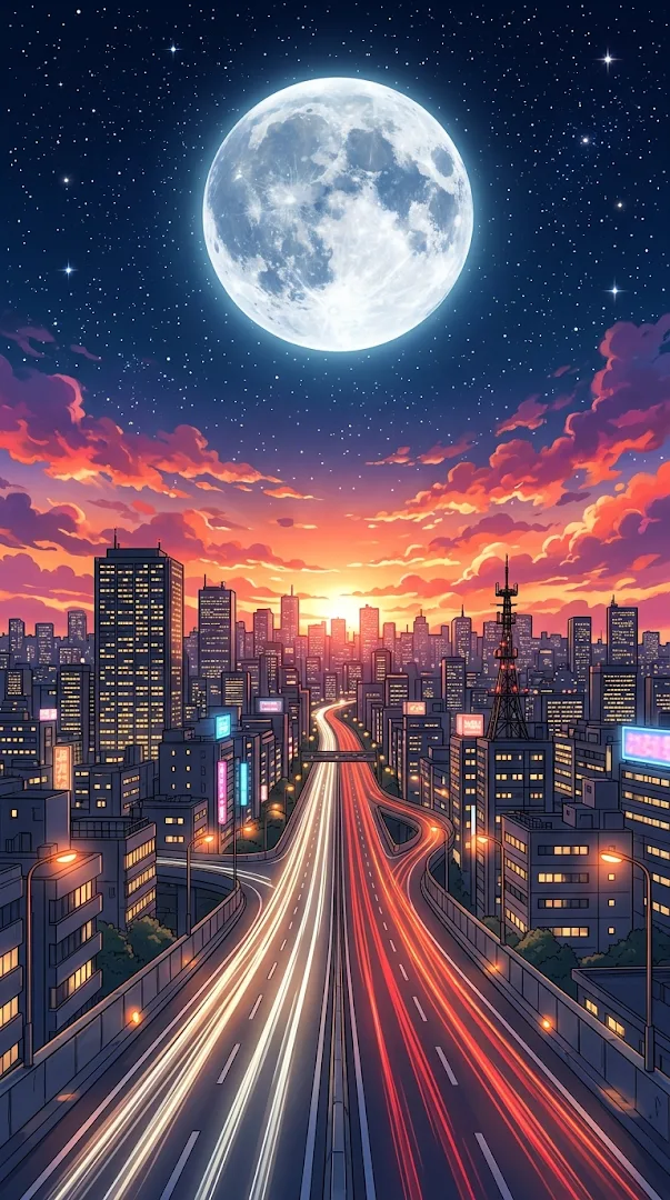 A vertical cityscape captures a vibrant sunset horizon transitioning into a starry night sky with a prominent moon.