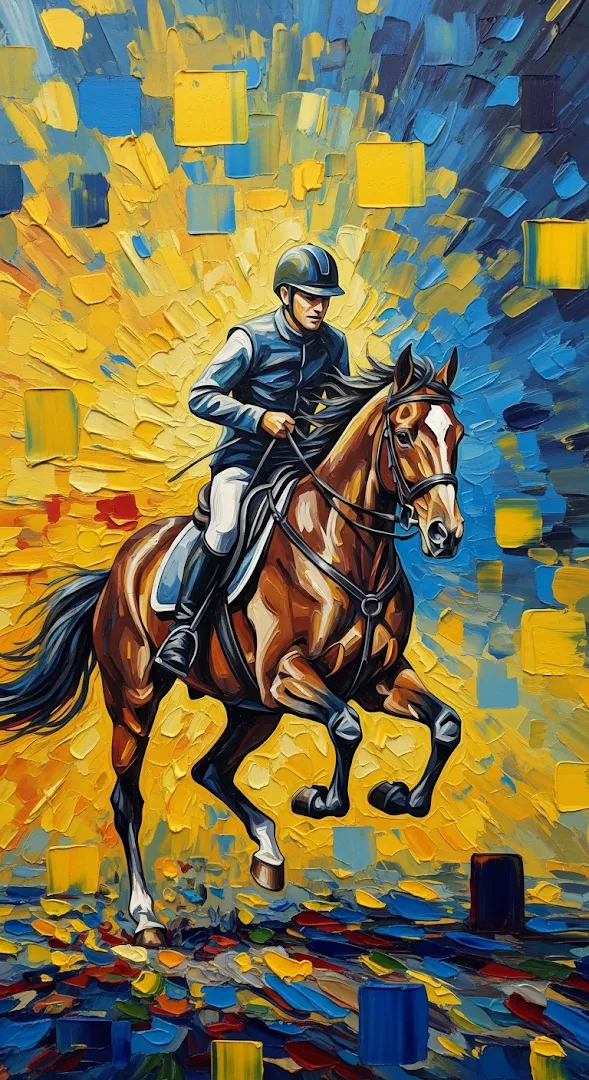 A dynamic vertical abstract illustration of a horse and rider created with thick, geometric palette knife strokes.