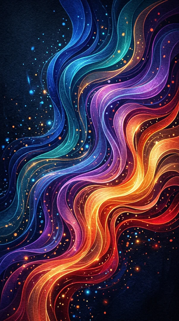 A vibrant, abstract vertical composition of overlapping, textured ribbons flowing diagonally with a glowing aesthetic.