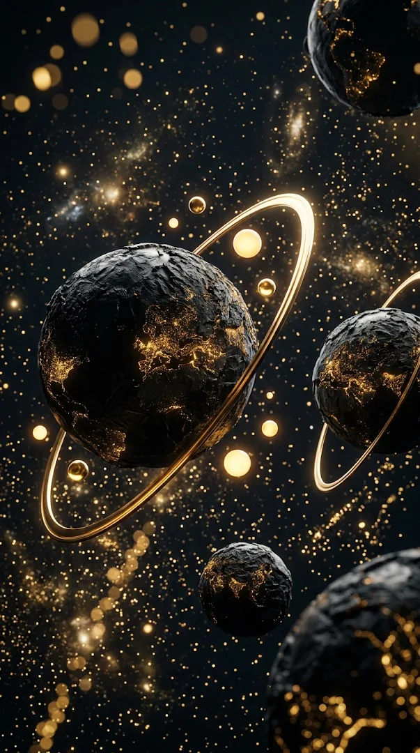 A luxurious cosmic-themed abstract render using high-contrast materials and celestial physics.