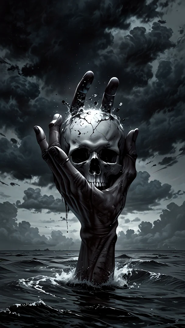 A dramatic, monochromatic scene of horror and despair. A massive, dark hand emerges from the churning, black ocean waves, holding a cracked, water-splashed skull aloft against a backdrop of heavy, ominous storm clouds.