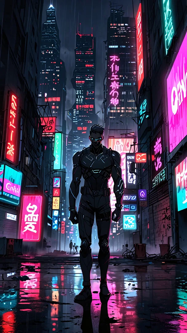 A powerful, armored vigilante stands centrally on a rain-slicked futuristic Tokyo street, surrounded by towering skyscrapers and vibrant, glowing neon signage in pink, cyan, and red, capturing a dark, wet cyberpunk aesthetic.