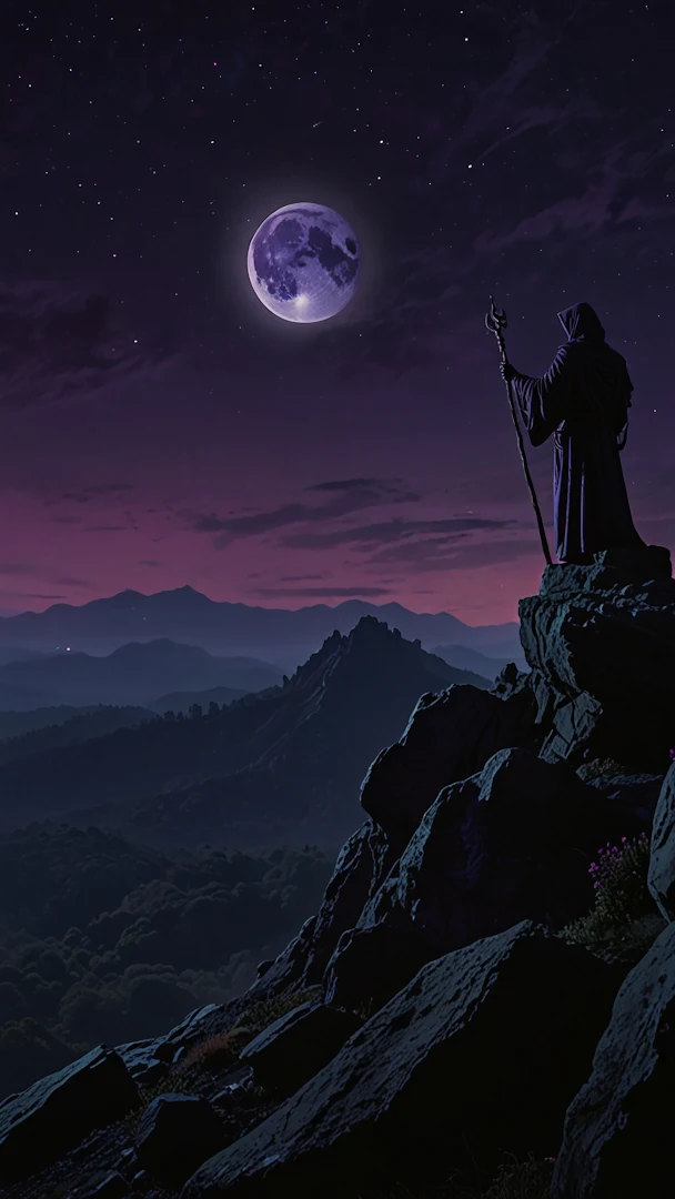 A solitary hooded figure stands on a rocky cliff, staff raised, gazing at a luminous purple moon against a starry twilight sky above layers of misty mountains.