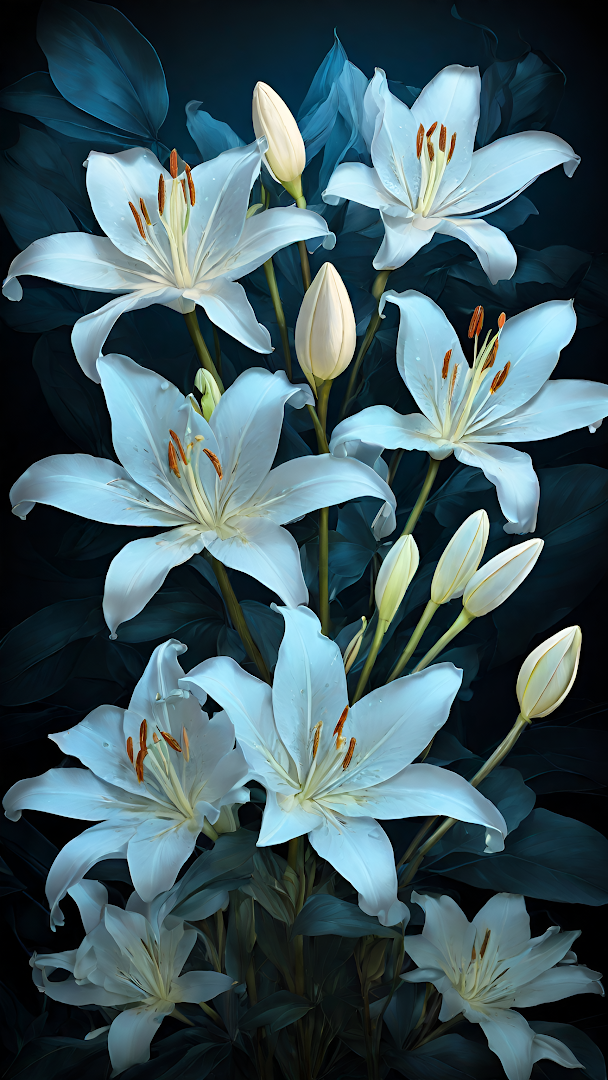 Delicate white lilies with golden stamens and dew-kissed petals stand out against a backdrop of dark, velvety blue-green leaves, creating a serene and sophisticated floral composition.