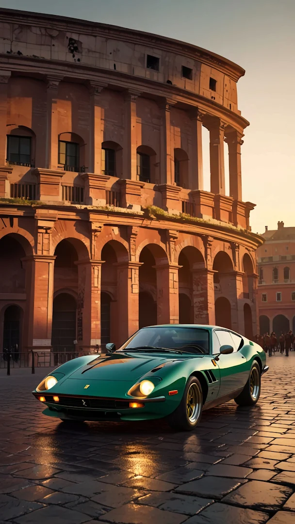 A sleek, emerald green classic Ferrari is parked on cobblestones before the ancient Colosseum, bathed in warm golden hour light that highlights its curves and historic backdrop.