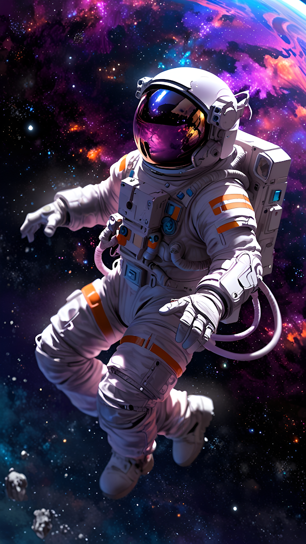 A detailed depiction of an astronaut in a white suit floating against a breathtaking backdrop of a swirling, vibrant purple and pink nebula. The scene captures the isolation and beauty of deep space exploration.