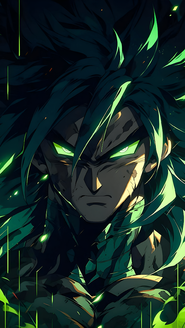 A highly stylized, dark portrait of an enraged anime warrior. His spiky hair and eyes glow with intense emerald green energy, set against a deep, shadowed background, conveying raw power and aggression.