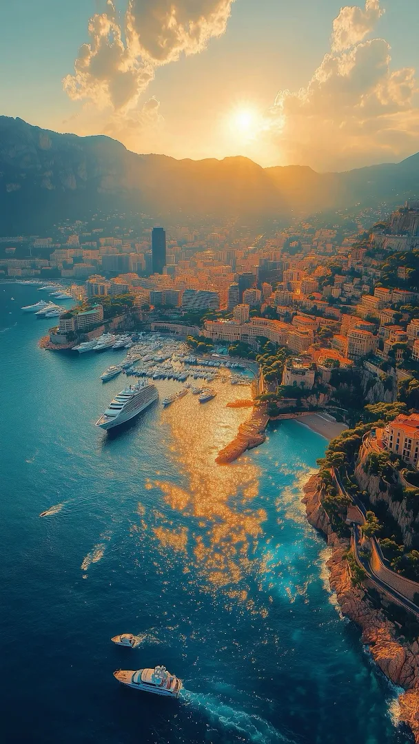A breathtaking aerial view of a luxurious coastal city nestled against steep cliffs during sunset. Golden light bathes the terracotta buildings and reflects brilliantly across the turquoise marina waters, highlighting large yachts.