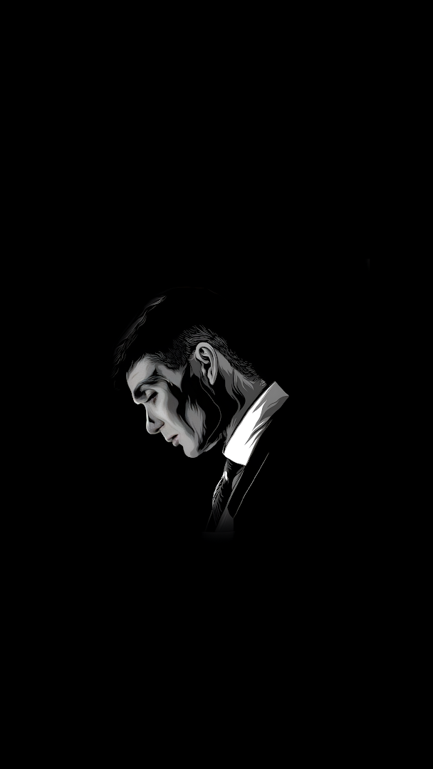 A high-contrast, black and white vector illustration of a sharp-dressed man in a suit, often associated with the character Tommy Shelby. The profile view emphasizes the brooding, dark mood against a pure black background.