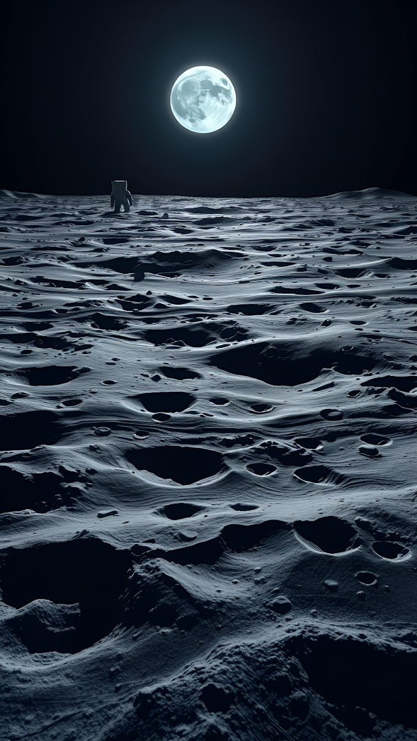 A dramatic, low-angle view of a desolate, cratered lunar landscape. A solitary astronaut stands silhouetted against the massive, glowing full moon in the dark expanse of space, evoking feelings of isolation and exploration.