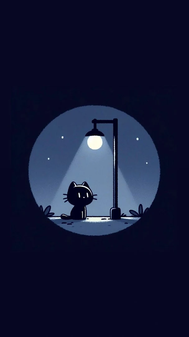 Charming, minimalist illustration of a tiny black cat sitting alone under the bright glow of a street lamp. The scene is rendered in deep blue tones, creating a cozy, isolated spotlight effect.