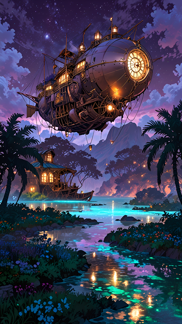 A fantastical scene featuring a massive, illuminated steampunk airship hovering above a vibrant tropical landscape at dusk. The glowing lights reflect brilliantly off the turquoise and purple water of the lagoon.