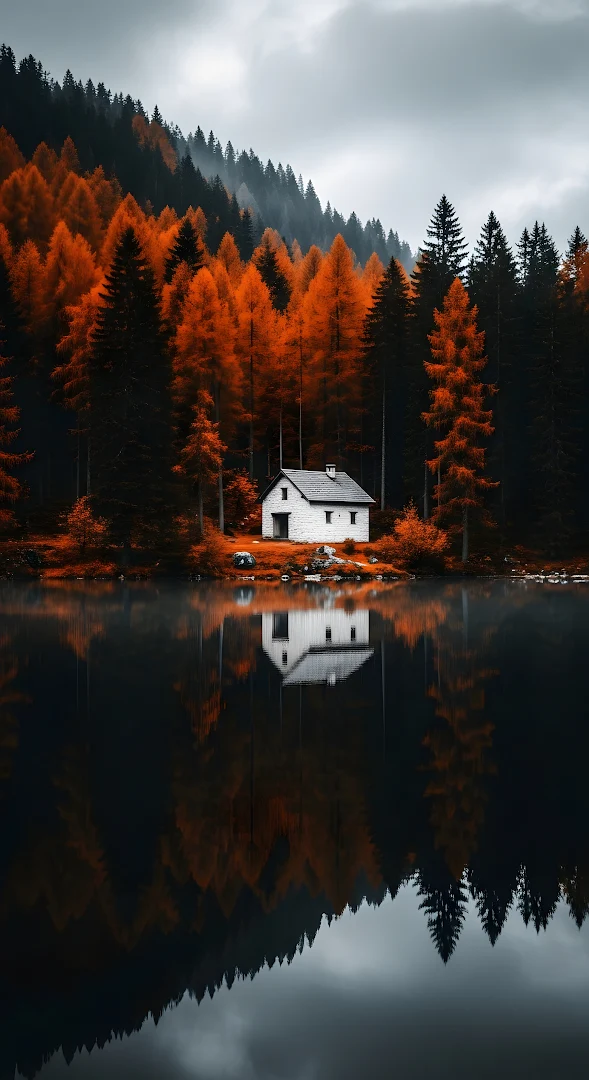 A moody scene featuring a small white stone cabin nestled between dark pine trees and vibrant orange autumn foliage, perfectly reflected in the still, dark water of a forest lake.