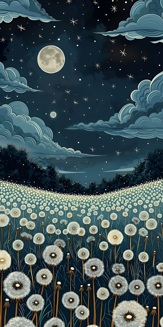 A magical, stylized illustration of a vast field of glowing white dandelions stretching toward a dark forest line. Above, the full moon shines amidst swirling, deep blue clouds and scattered, twinkling stars.