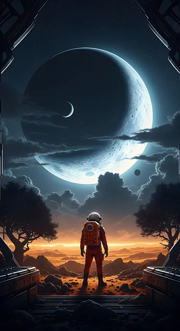 A lone astronaut in an orange suit stands on a desolate, rocky planet, framed by a spaceship hatch. Above, a colossal, brightly lit moon dominates the cosmic night sky, evoking feelings of deep space solitude and discovery.