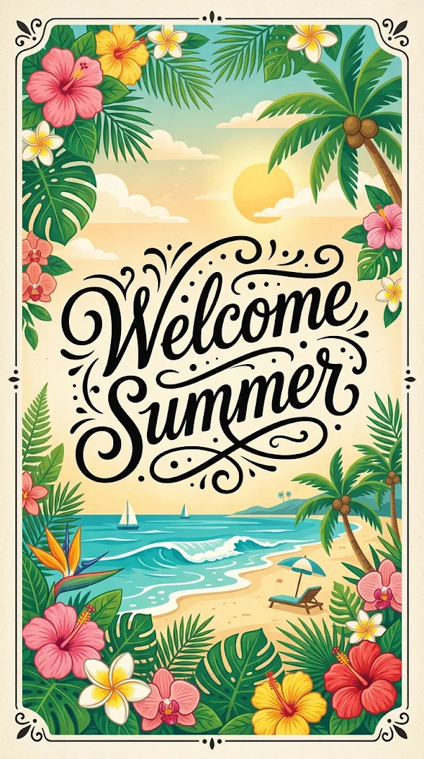 A vertical typographic graphic featuring a scenic beach framed by lush tropical flowers and a scripted greeting.