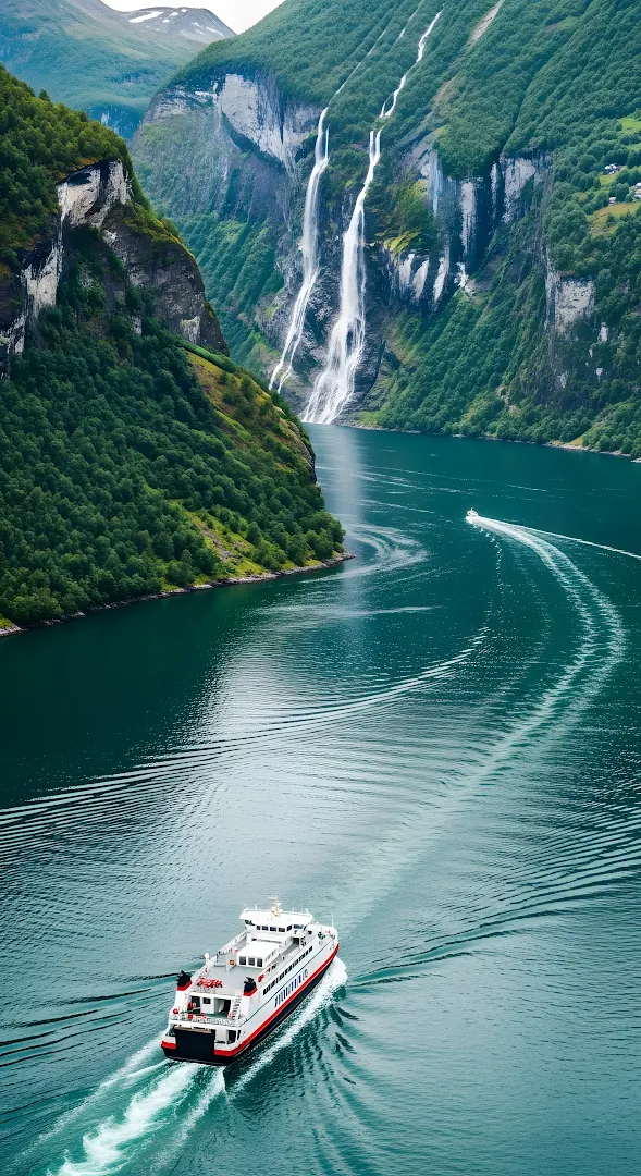 A high-angle view captures a ferry cruising through the deep emerald waters of a Norwegian fjord, passing towering green cliffs where the iconic Seven Sisters waterfalls cascade dramatically.