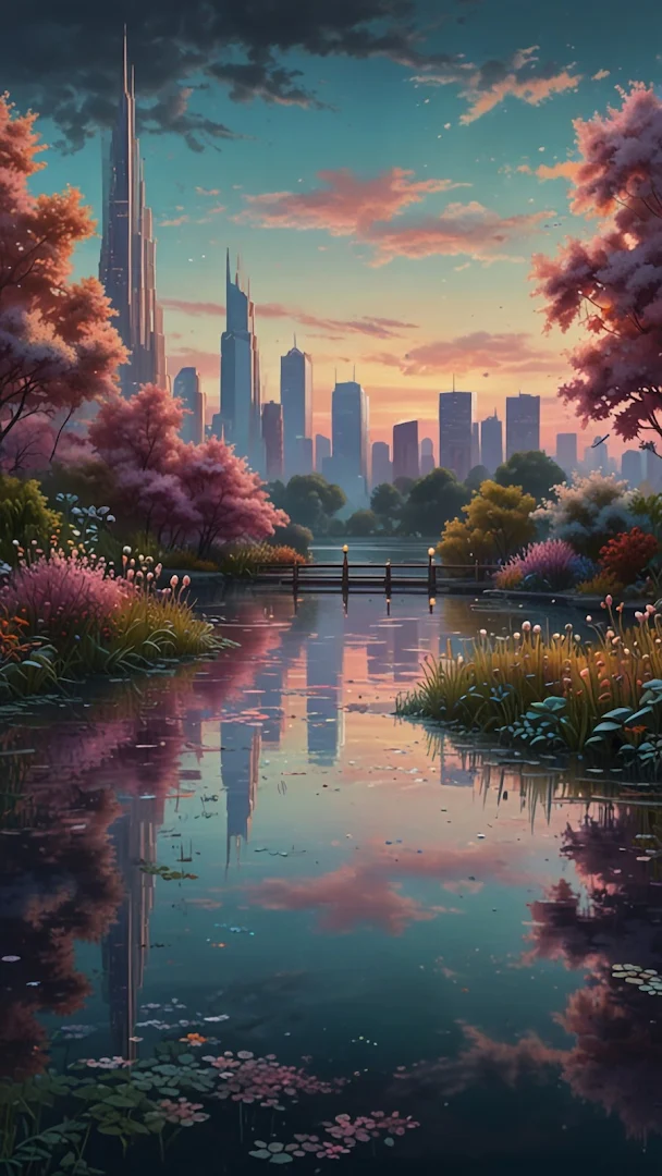 A serene, stylized cityscape view across a reflective pond framed by lush, pink flowering trees. The tall, modern skyline is mirrored in the water under a dramatic sunset sky, blending urban development with tranquil nature in an anime style.