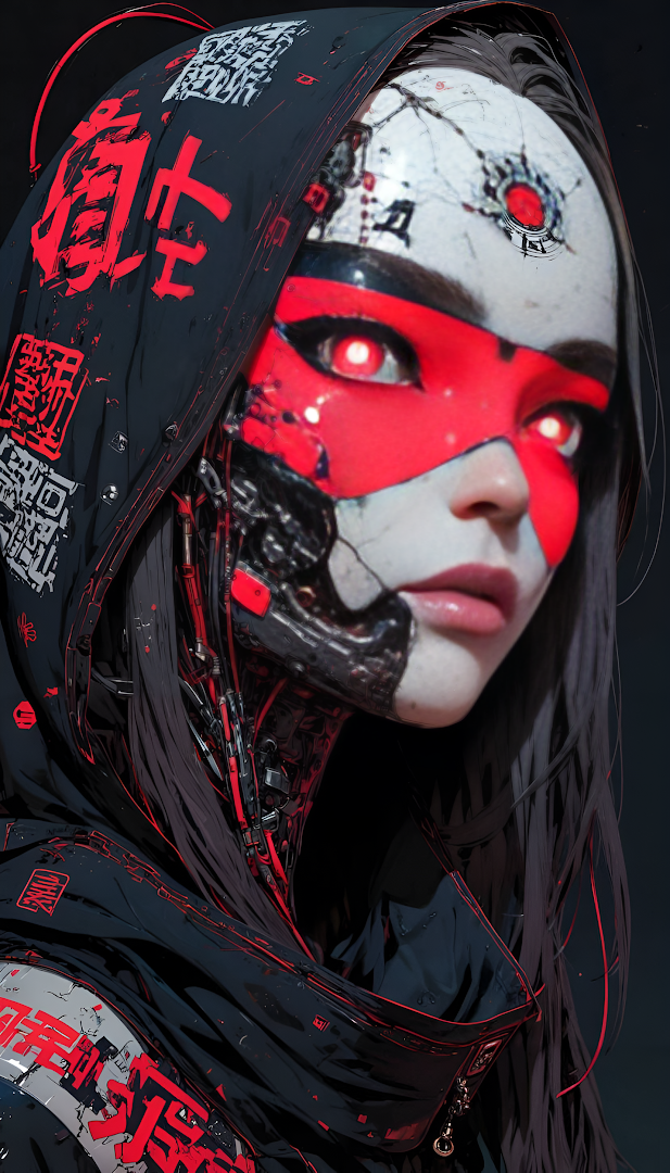 Intense, dark portrait of a female cyborg wearing a black hood adorned with red Japanese text. Her face is cracked porcelain, revealing complex mechanical components and glowing red eyes behind a striking red mask.