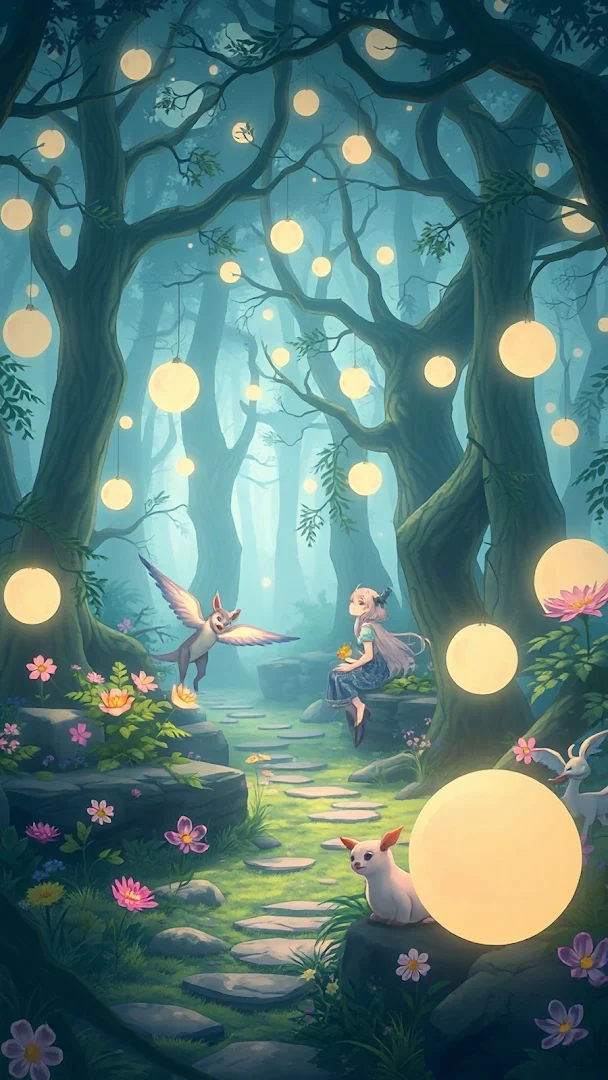 A magical digital painting of a deep, twilight forest illuminated by numerous glowing orb lanterns hanging from ancient trees. A girl sits on a stone path, observing a winged creature and small white companions among vibrant flowers.