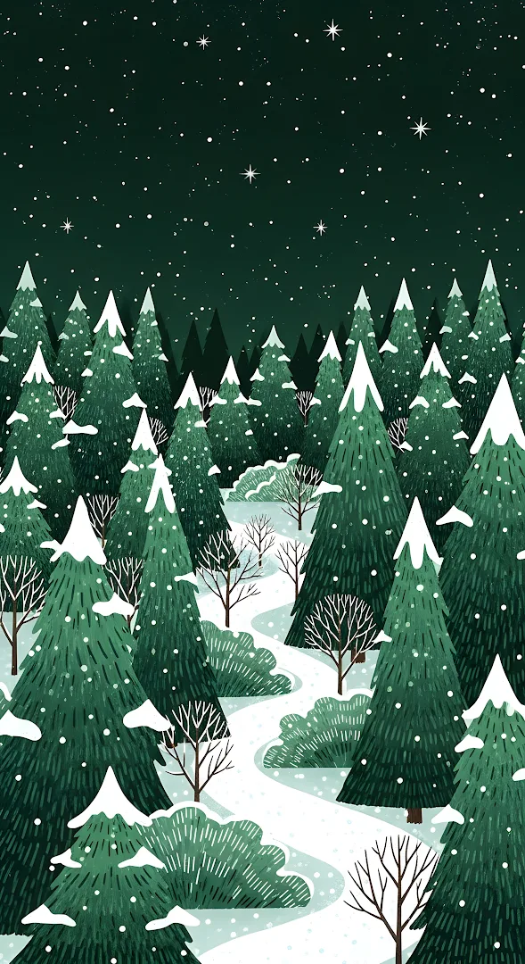 A charming vertical illustration depicting a dense, snow covered pine forest under a dark green starry night sky. A winding white path leads through the trees, evoking a peaceful, cold winter atmosphere.