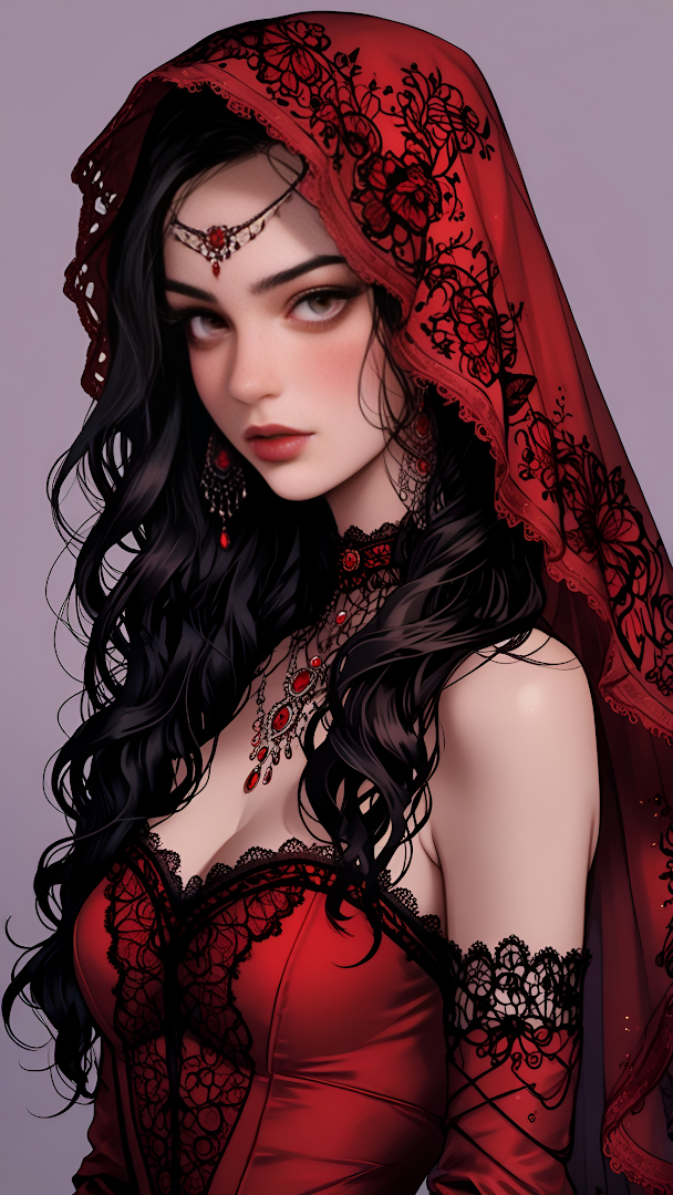 Striking fantasy portrait of a woman with long black hair, adorned in a vibrant red lace veil and matching corset. Her intense gaze and dark jewelry suggest a gothic or vampire queen aesthetic.