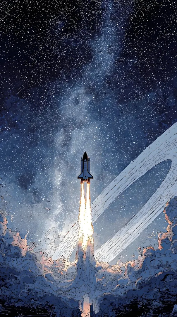 A dramatic comic book style illustration of a space shuttle launching into the vast, star-filled night sky, leaving a massive, stylized plume of fire and smoke.